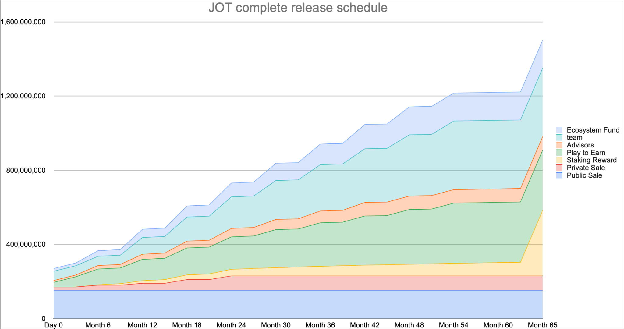 JOT will be unlocked in a pre-determined schedule which lasts for 24 months from the public sale. The initial circulating supply is set to 375,000,000 JOT - 25% of the total supply.